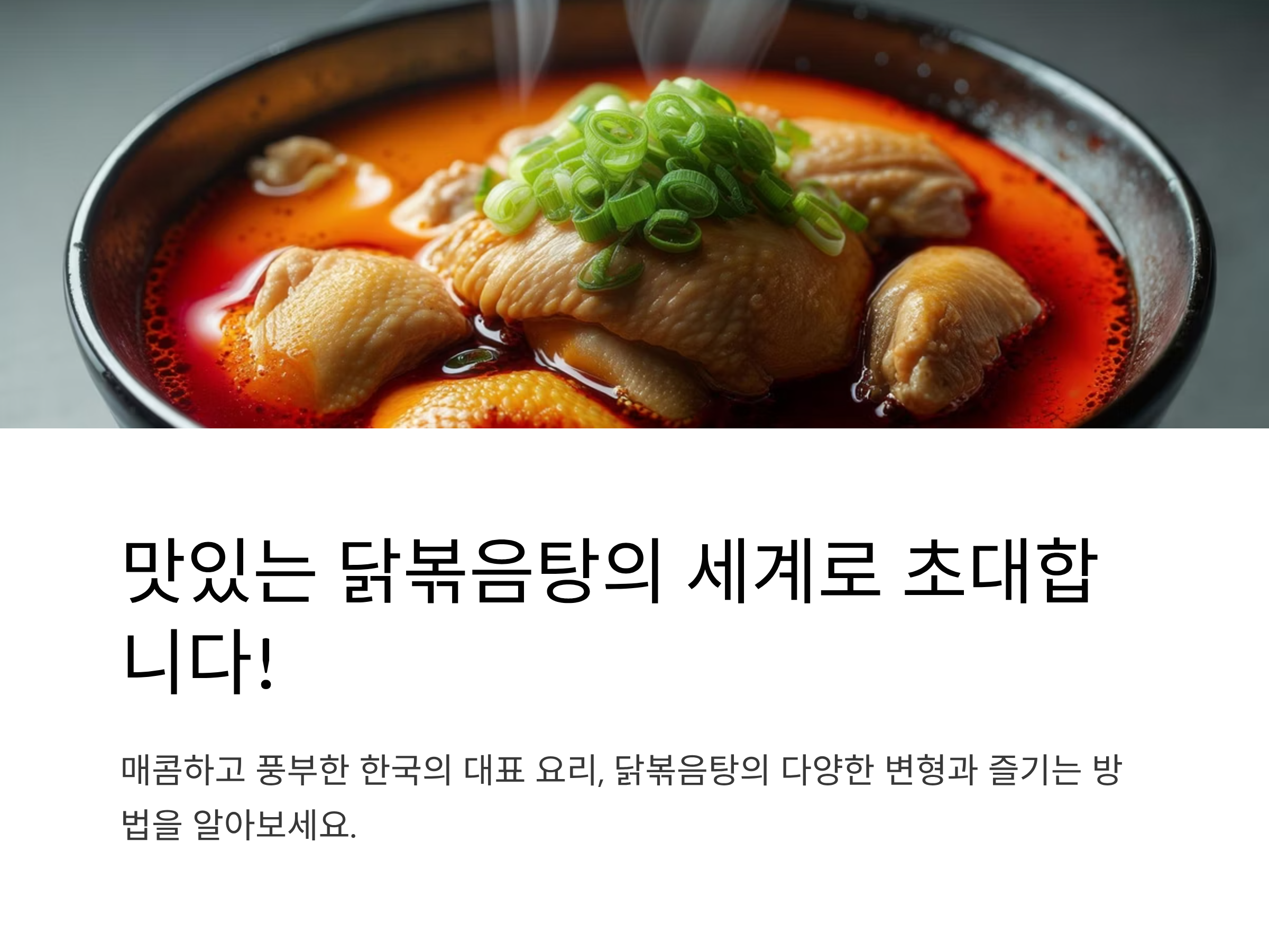 닭볶음탕은 닭고기와 감자, 당근, 양파 등을 고추장 양념에 졸여낸 한국 대표 가정식 요리입니다.