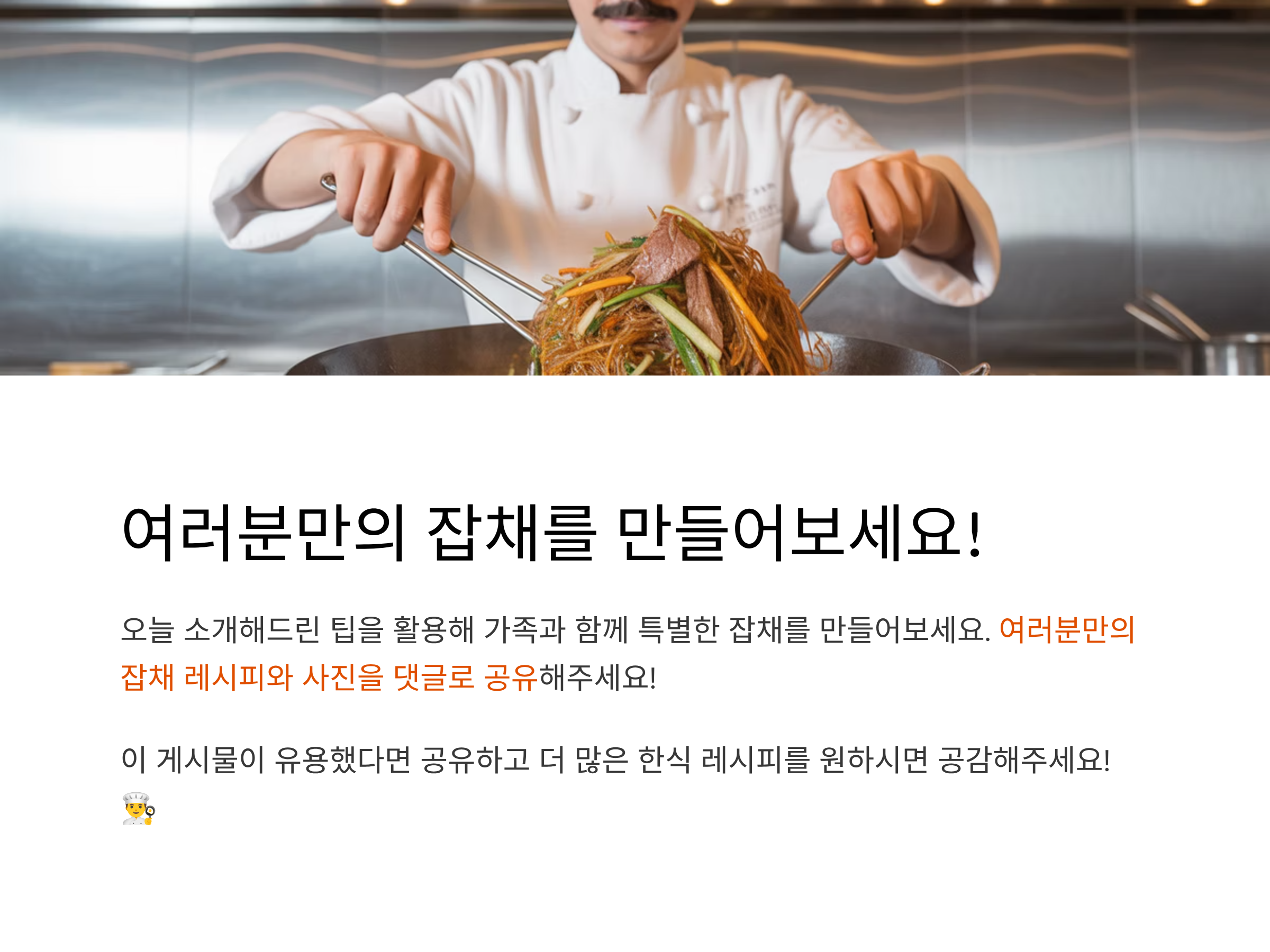 - 응용성 높음 → 고기 대신 버섯만 넣으면 채식 잡채 가능