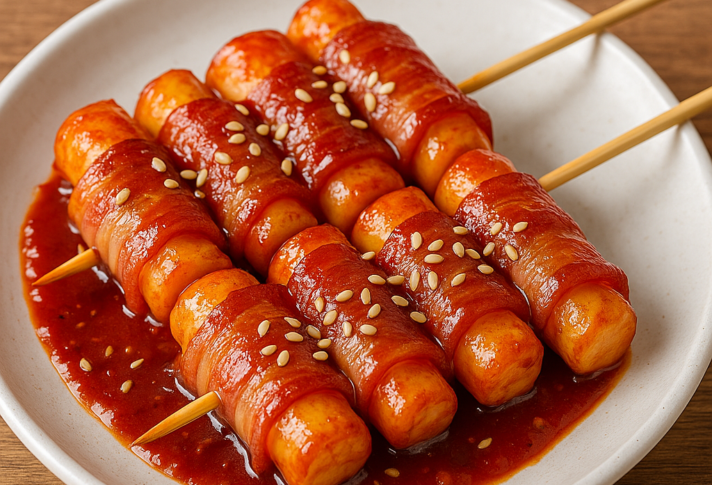 떡꼬치는 떡을 꼬치에 꽂아 달콤매콤한 양념에 버무려 먹는 인기 간식인데, 여기에 짭조름한 베이컨을 더하면 훨씬 풍미가 깊어집니다.